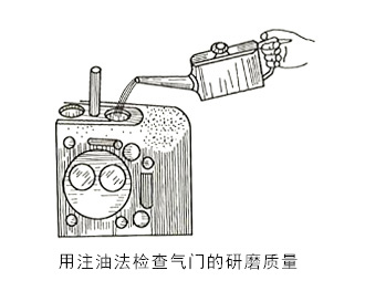 将磨好的气门装入座内,加入少许汽油或柴油,如下图所示。若5min内气门与座之间没有渗漏现象,则表示气门密封良好。