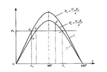 5、大型发电机失磁易引起发电机振荡,失磁前的有功功率越大,失磁后吸收的无功也越大,发电机端电压下降越大,发电机输出功率降低,功角特性由1转向2,从a点向b点运行,因为过剩力矩的出现,转子加速使功角δ增大,从b点向c点运行,由于转子惯性,使之越过c点,使功角δ大于90°,达到d点,到d点后由于异步力矩的作用及惯性的消失,向c点运行到达c点,由于惯性又向b点,这样来回摆动,转速时高时低,这就形成了发电机的振荡。