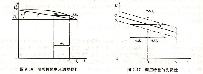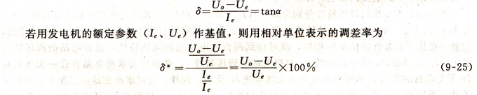 在一般情况下,调压特性是一条U=fI)的曲线。I为发电机的无功电流,如图9.16中的曲线。在图9.16中,Ie为发电机的额定无功电流,U0Ue分别为发电机空载时及额定无功负载的电压。为了方便起见,通常用一条直线(图中的曲线2)近似地取代曲线1,并用以下参数表征调压特性。