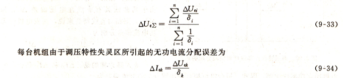 对于n台机组并联的情况,仿照式(9-30)和式(9-31)的推导方法,可以求出整个电站调压特性的失灵区为