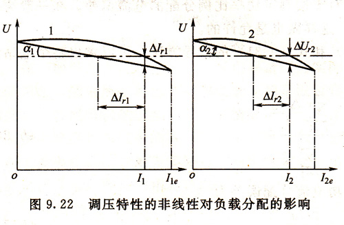 并联运行的发电机中有一台具有无差特性,只能说在一定条件下是可行的,如图9. 21中特性1是无差的、特性2是有差的,整个电站的特性3也是无差的(为了简单,各特性的失灵区均未绘出),具有特性2的发电机总是以固定的电流,2(在土Ale2的精度范围内)运行,对于任何负载电流I来说,无差特性发电机的无功电流为I1=I- I2。对于I变化不大的电站,采用一台机组承?;靖涸?,另一台机组承担浮动性负载,以获得电压严格稳定,这样做也是可行的。当然,这里就谈不上无功负载严格均衡分配了。任何调压器的失灵区总是不可避免的,也就是说调压特性的失灵区总是存在的。为了提高无功负载分配的精度,应该尽量减小失灵区,采用灵敏度较高的调压装置,如半导体晶闸管调压系统,可控相复励调压系统等,同时还应该保证调压特性具有一定的调差率。增大调差率固然对功率分配有利,但调差率代表了发电机从空载到额定无功负载的电压变化幅度,调差率过大显然对维持电压稳定是不利的。多数标准规定相对调差率δ*不应大于2.5%—3.5%。
