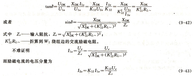 均为已知,现应适当选取U1o,以确定出W1的匝数。一般U1o的选择范围为U1o=(0.15~0.35)Ue,Ue为发电机的额定线电压。若U1o选得偏低(即K12偏低),则I1o偏大,移相电抗器DK的功率必然较大,增大了电抗器的重量和体积;若U1o选得过高,则虽然减小了电抗器的功率、重量和体积,但移相角较小,移相效果不够理想。